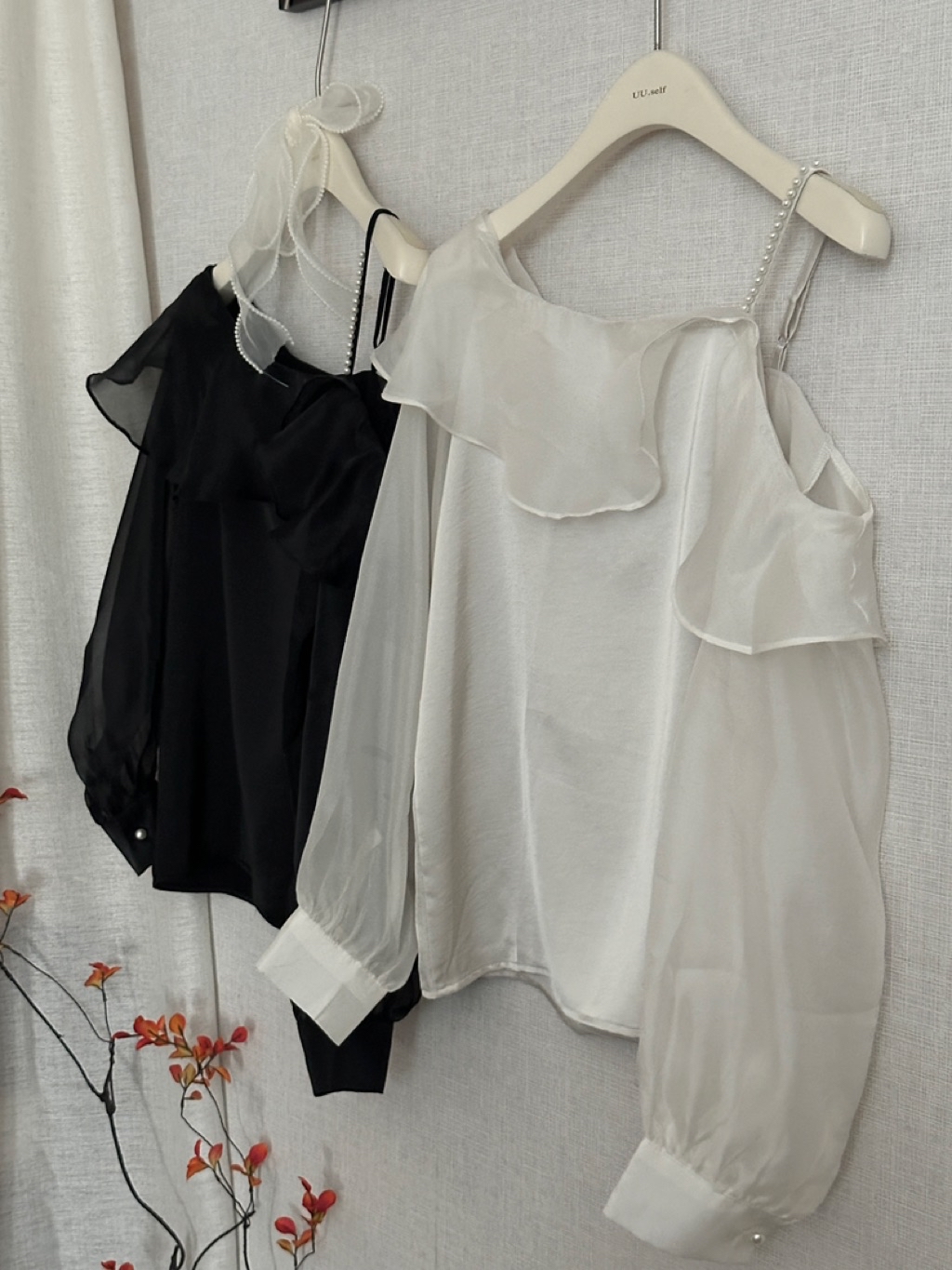 UU.self- 絲光飄飄 單邊珍珠露肩雪紡上衣2colors